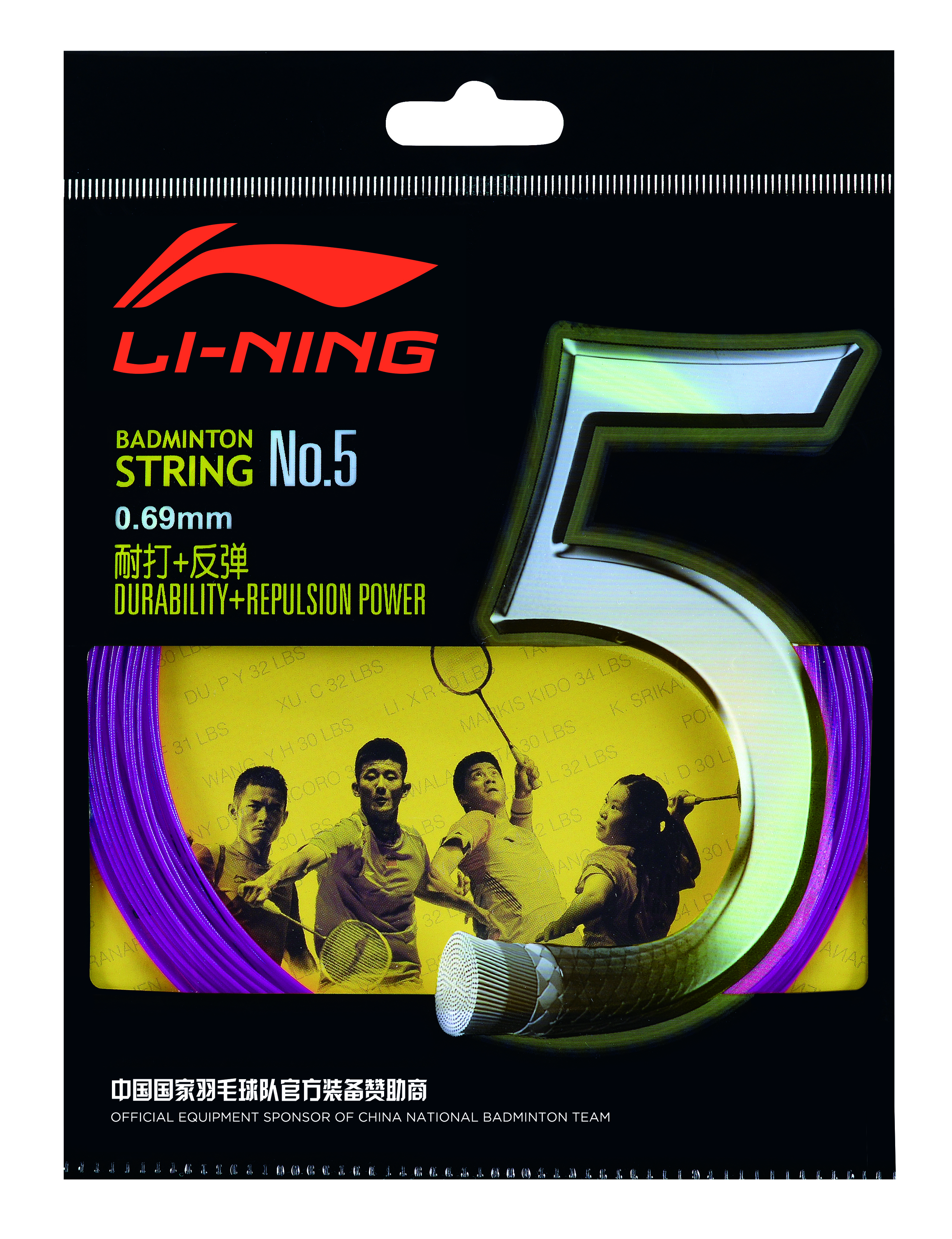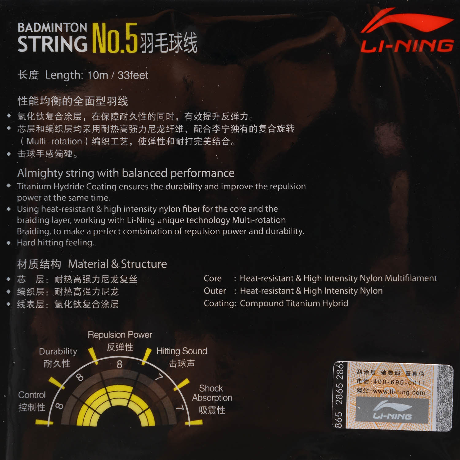 Durch Verwendung von hitzebeständigem und hochintensivem Nylon-Fiber Material für Kern und Flechtschicht sowie der Li-Ning Multi-Rotations-Flecht-Technologie wird die Saite haltbarer und härter gemacht.