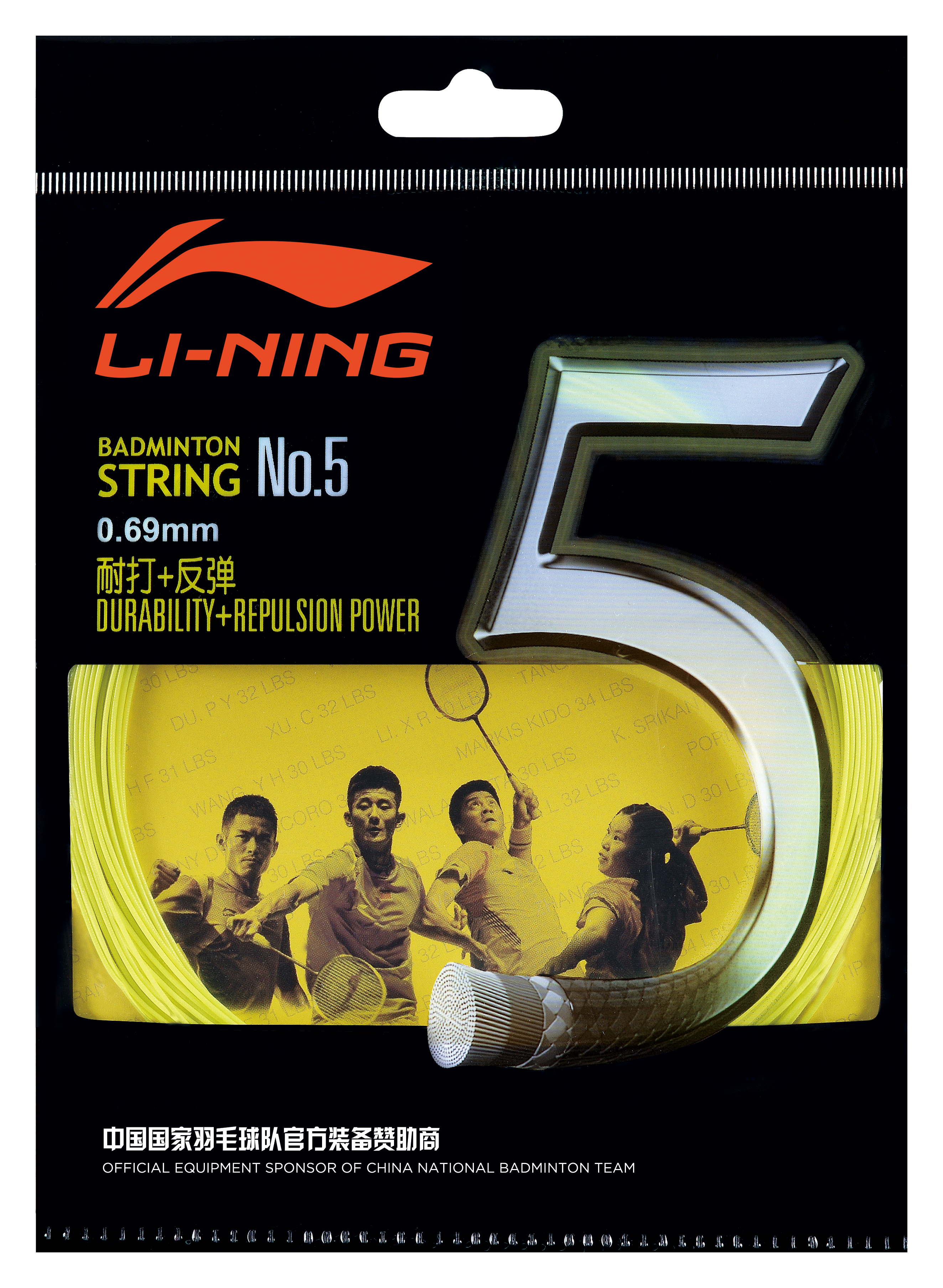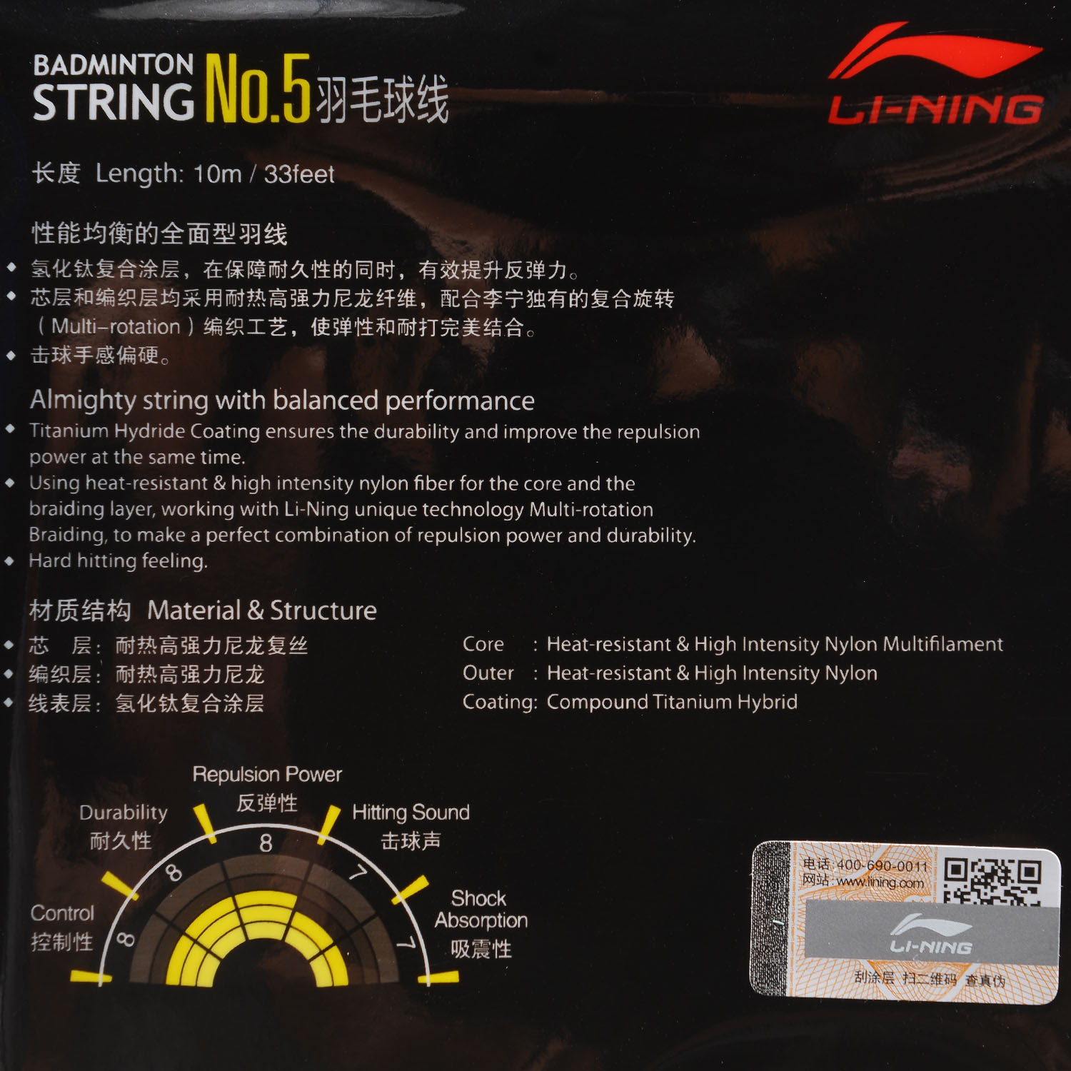 Durch Verwendung von hitzebeständigem und hochintensivem Nylon-Fiber Material für Kern und Flechtschicht sowie der Li-Ning Multi-Rotations-Flecht-Technologie wird die Saite haltbarer und härter gemacht.